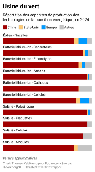 Cette domination s’étend à l’ensemble des technologies clés de la transition énergétique : 70% des batteries de véhicules électriques, 80% des panneaux solaires et 68% des installations d’éoliennes.